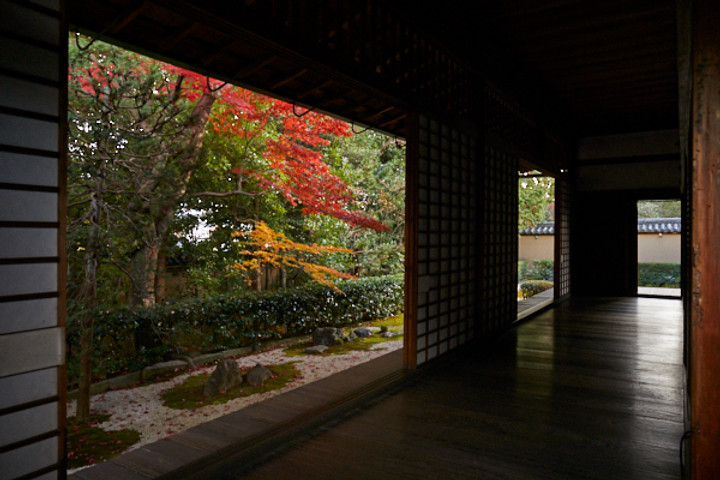 次に向かったのは紫野。棟梁所縁の深い大徳寺「真珠庵」です。常は非公開のこの塔頭では、入母屋造・檜皮葺の方丈(長谷川等伯の障壁画も!)、入母屋造、杮葺の書院・通僊院、そして金森宗和好みと伝えられる二畳台目下座床の茶室「庭玉軒」などを、これまた義明棟梁の解説付きでたっぷりと鑑賞しました。